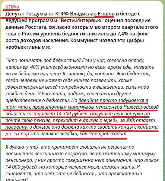 У Росстата, видимо, совершенно другое представление о бедности. Но давайте просто задумаемся в том, что с прожиточным минимумом пенсионера Нижегородской области составляет 14 300 рублей. Получает пенсионерка на почте свою пенсию, переходит в другую очередь, за ЖКХ отдает половину, и дальше она должна как-то сводить концы с концами. До сих пор это великая загадка, как это происходит.